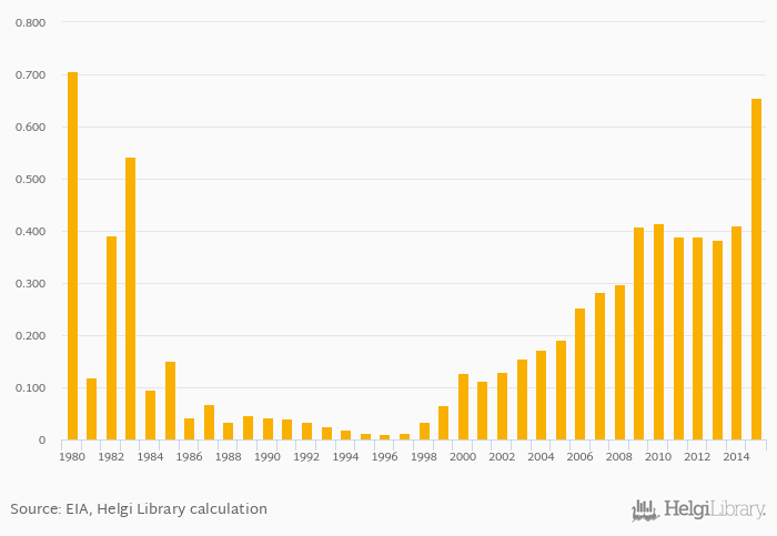 Kerosene consumption as a share of worldwide consumption rose 59.6% to 0.654% in France in 2015, according to EIA.