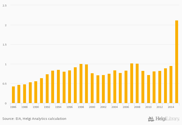 Kerosene consumption as a share of worldwide consumption rose 122% to 2.12% in South Africa in 2015, according to EIA.