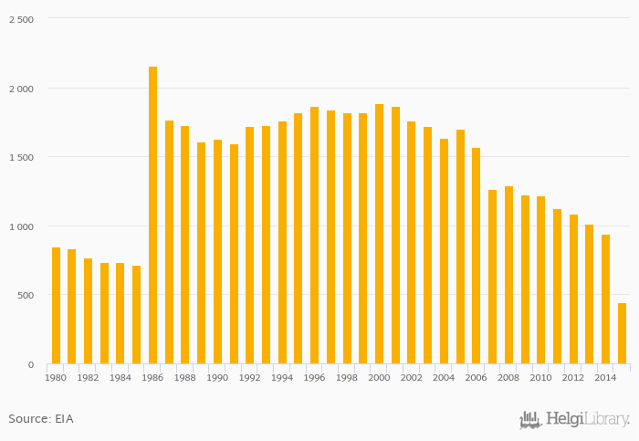 Historically, kerosene consumption in the World reached an all time high of 2,153 '000 bpd in 1986 and an all time low of 445 '000 bpd in 2015. When compared to World's main peers, kerosene consumption in China amounted to 25.3 '000 bpd, 0.110 '000 bpd in Germany, 297 '000 bpd in Japan and 9.00 '000 bpd in USA in 2015.