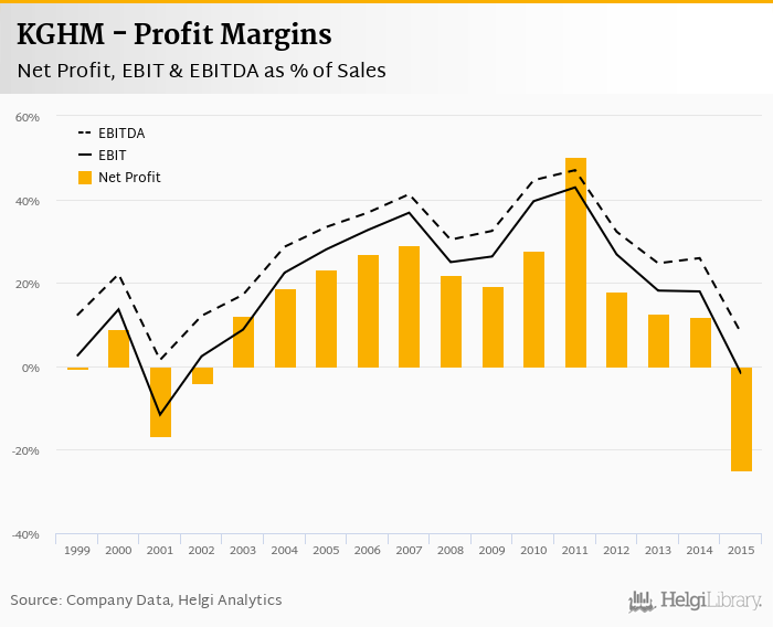 KGHM made a net profit of PLN -5,012 mil with revenues of PLN 20,008 mil in 2015, down by 305% and down by 2.36%, respectively, compared to the previous year.