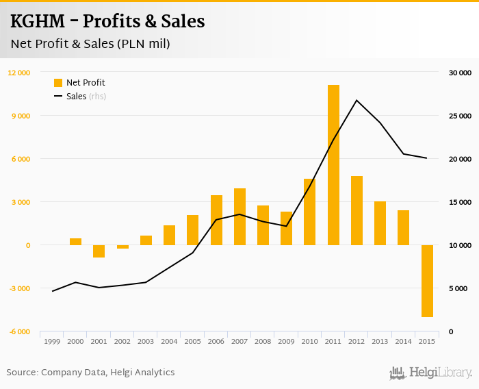 KGHM made a net profit of PLN -5,012 mil in 2015, down 305% compared to the previous year. Total sales reached PLN 20,008 mil, which is down 2.36% when compared to the previous year.