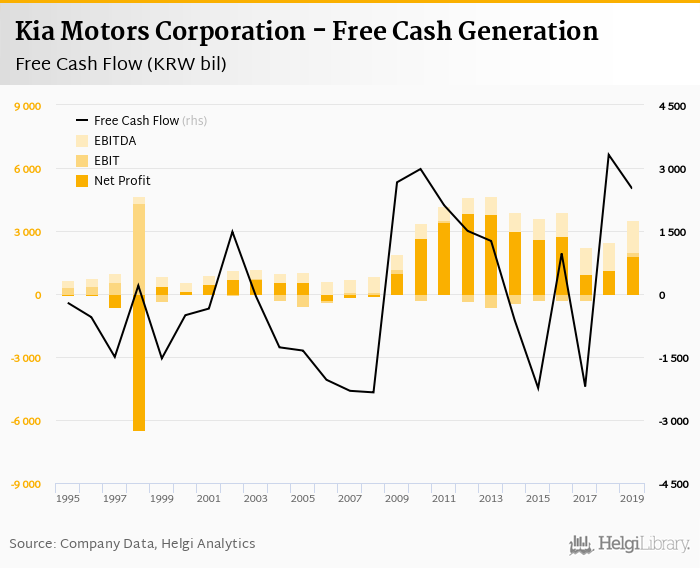 Kia Motors Corporation made a net profit of KRW 1,827 bil with revenues of KRW 58,146 bil in 2019, up by 58% and up by 7.34%, respectively, compared to the previous year. This translates into a net margin of 3.14%.