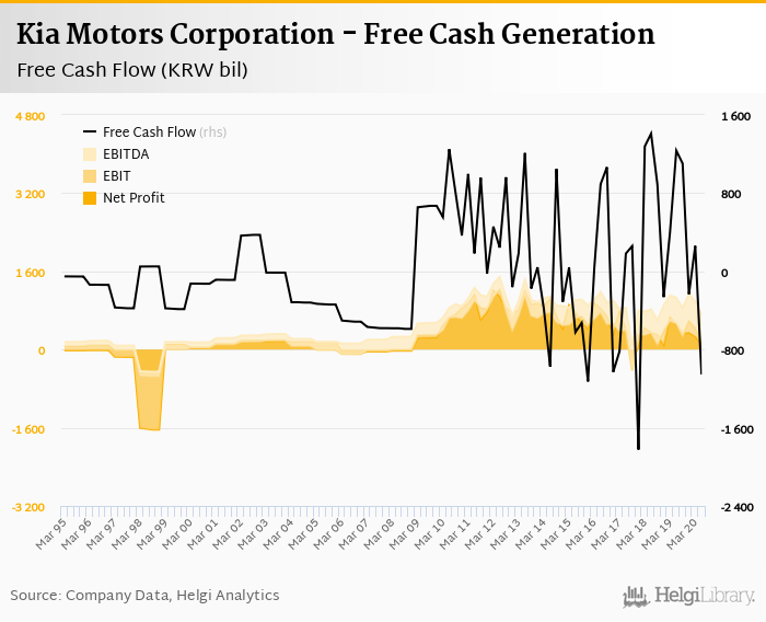Kia Motors Corporation made a net profit of KRW 126 bil with revenues of KRW 11,369 bil in 2Q2020, down by 75% and down by 21.6%, respectively, compared to the previous year. This translates into a net margin of 1.11%.