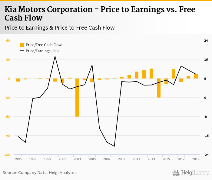 Regarding cash generated defined by the sum of net profit and depreciation, the stock traded at 5.29x at the end of 2019. When investments are excluded to get free cash flow, Kia Motors Corporation traded at 7.09x.