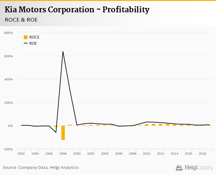 As far as Kia Motors Corporation's peers are concerned, Hyundai Motor Company generated ROE of 3.05% and ROCE of 2.01% in 2019. Volkswagen Group's profitability reached 11.1% and 3.61%, respectively. PSA Peugeot Citroen operated with 15.5% and 10.4% returns in 2019.
