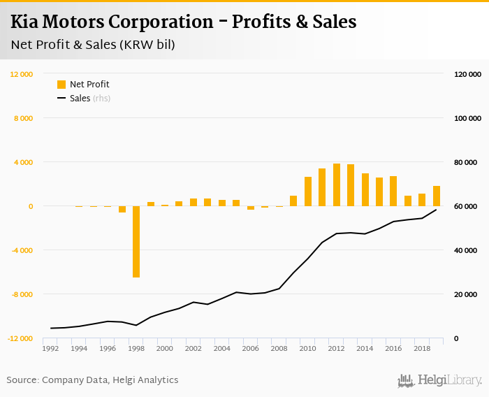 Kia Motors Corporation made a net profit of KRW 1,827 bil in 2019, up 58% compared to the previous year. Total sales reached KRW 58,146 bil, which is up 7.34% when compared to the previous year.