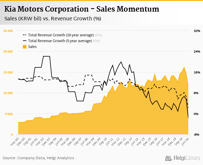 Kia Motors Corporation generated sales of KRW 11,369 bil in 2Q2020, down 21.6% compared to the previous year. Historically, between 1Q1990 and 2Q2020, the company’s sales reached a high of KRW 16,105 bil in 4Q2019 and a low of KRW 816 bil in 1Q1990.