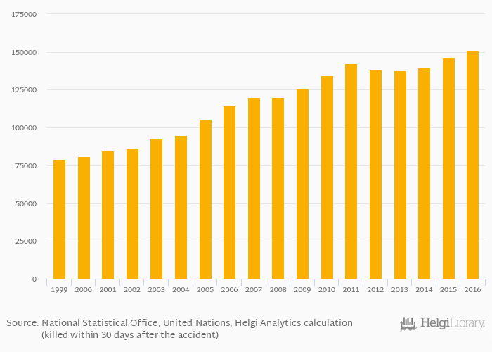 Historically, killed in road traffic accidents in India reached an all time high of 150,785 persons in 2016 and an all time low of 78,911 persons in 1999.