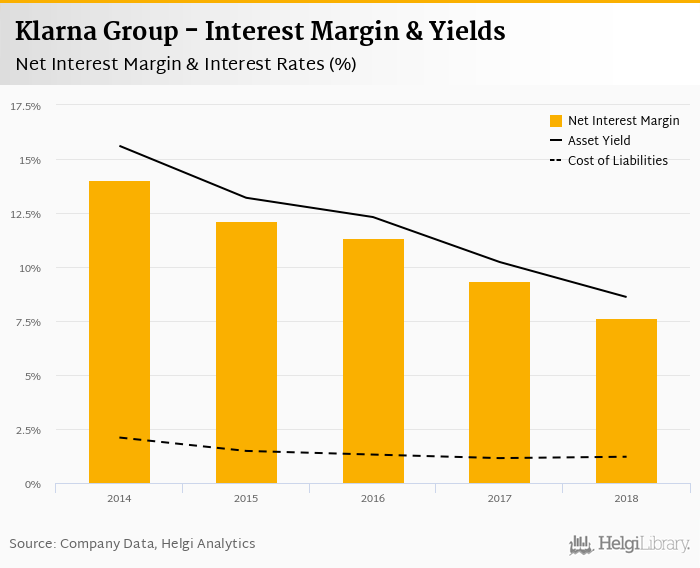 Klarna Group's net interest margin amounted to 7.63% in 2018, down from 9.34% compared to the previous year.