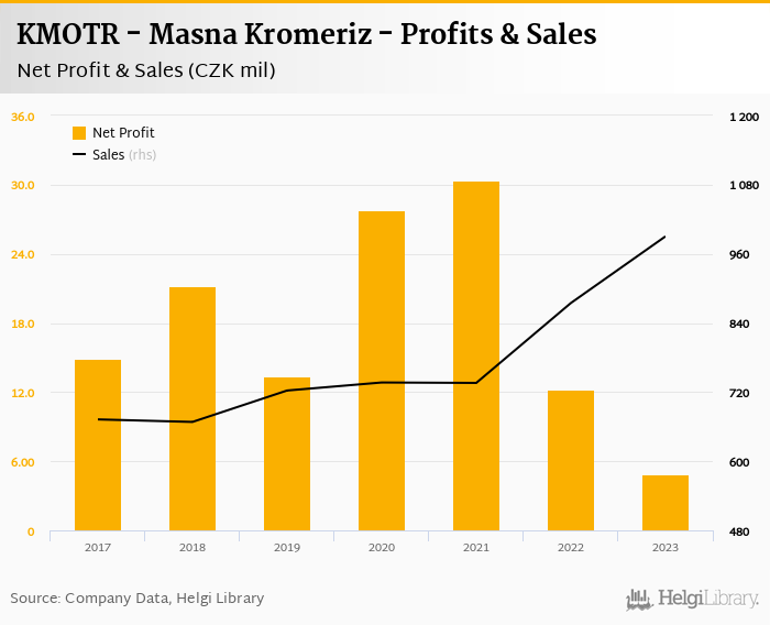 KMOTR - Masna Kromeriz made a net profit of CZK 4.91 mil in 2023, down 59.9% compared to the previous year. Total sales reached CZK 990 mil, which is up 13.2% when compared to the previous year.