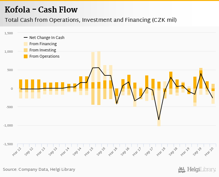 Cash from financing amounted to CZK -340 mil, so the company generated CZK -271 mil net cash in 1Q2020.