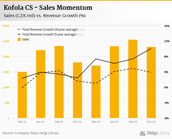 Kofola CS generated sales of CZK 2,319 mil in 4Q2023, up 28% compared to the previous year. Historically, between 1Q2012 and 4Q2023, the company’s sales reached a high of CZK 2,556 mil in 3Q2023 and a low of CZK 1,155 mil in 1Q2021.