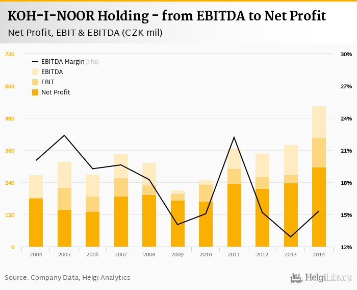 KOH-I-NOOR Holding made a net profit of CZK 297 mil with revenues of CZK 3,427 mil in 2014, up by 24.5% and up by 15.8%, respectively, compared to the previous year. This translates into a net margin of 8.66%.