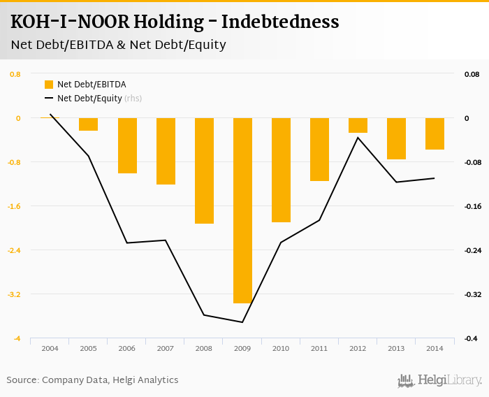 KOH-I-NOOR Holding's net debt stood at CZK -299 mil and accounted for -0.111 of equity at the end of 2014. The ratio is up 0.007 pp compared to the previous year.
