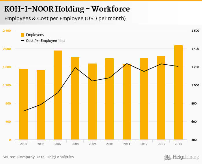 KOH-I-NOOR Holding employed 2,078 employees in 2014, up 12.7% compared to the previous year. Historically, between 2005 and 2014, the firm's workforce hit a high of 2,078 employees in 2014 and a low of 1,529 employees in 2006.
