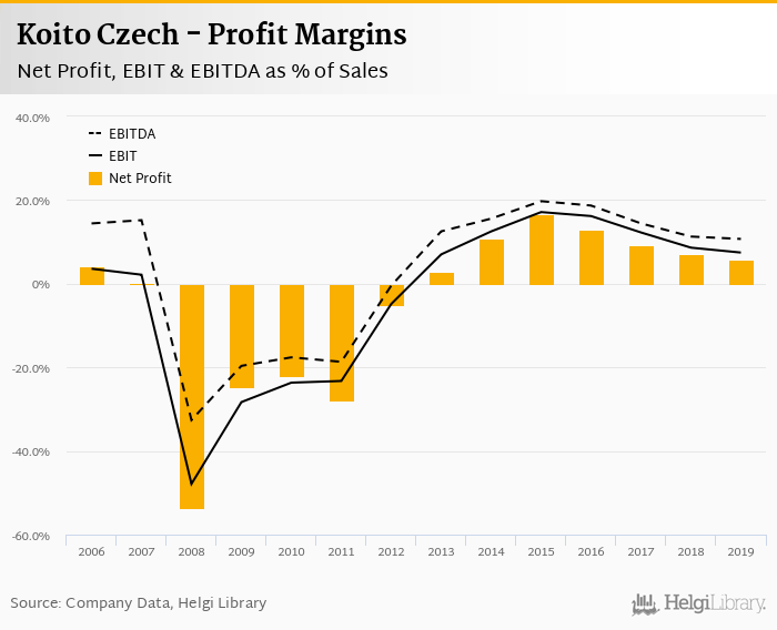 Koito Czech made a net profit of CZK 285 mil with revenues of CZK 4,971 mil in 2019, down by 21.7% and down by 4.75%, respectively, compared to the previous year.