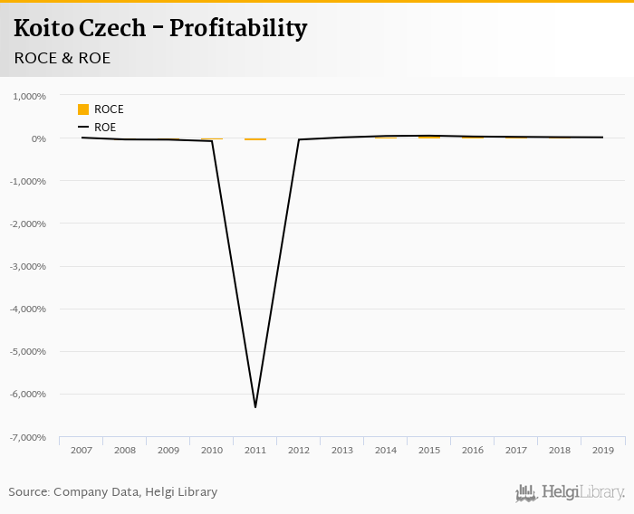 Koito Czech made a net profit of CZK 285 mil in 2019, down 21.7% compared to the previous year. Historically, between 2006 and 2019, the company's net profit reached a high of CZK 653 mil in 2015 and a low of CZK -505 mil in 2008.