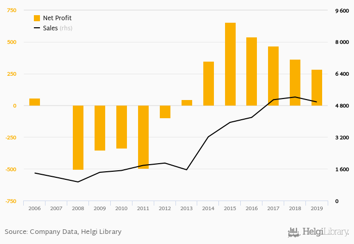 Sales have grown by 13.3% a year on average since 2009. They reached a high of CZK 5,219 mil in 2018 and a low of CZK 939 mil in 2008.