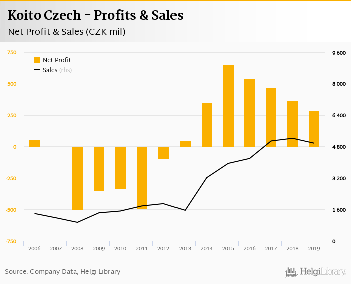 Koito Czech made a net profit of CZK 285 mil in 2019, down 21.7% compared to the previous year. Total sales reached CZK 4,971 mil, which is down 4.75% when compared to the previous year.
