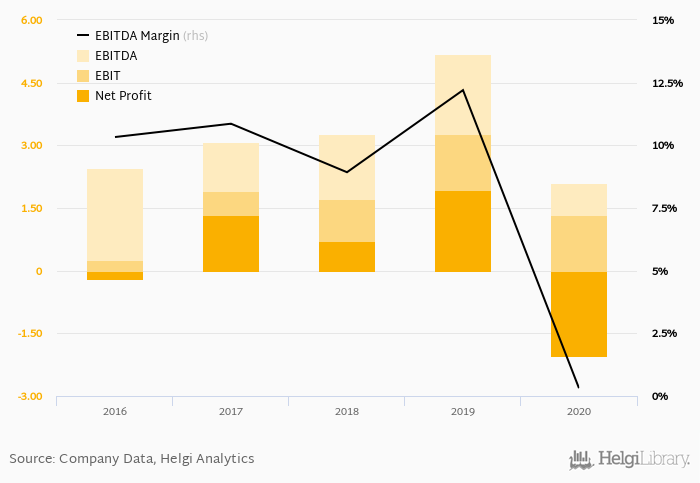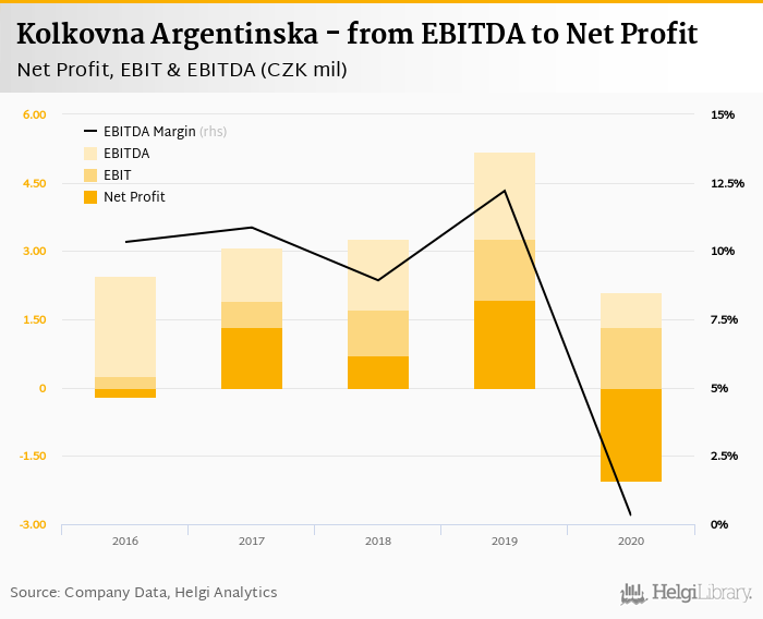 Kolkovna Argentinska made a net profit of CZK -2.04 mil with revenues of CZK 24.1 mil in 2020, down by 206% and down by 43.3%, respectively, compared to the previous year. This translates into a net margin of -8.46%.