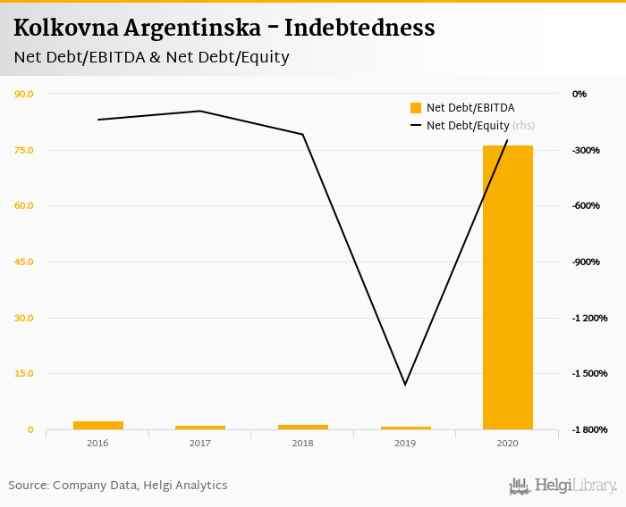 Kolkovna Argentinska's net debt stood at CZK 5.72 mil and accounted for -245% of equity at the end of 2020. The ratio is up 1,314 pp compared to the previous year.