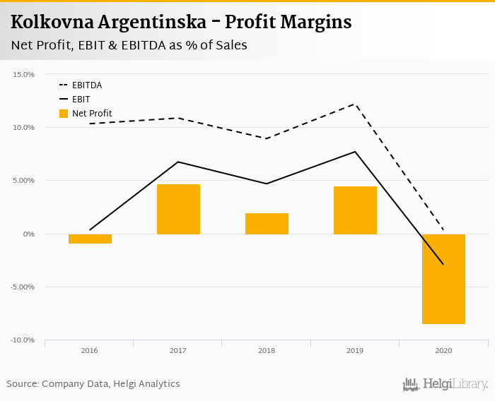 Kolkovna Argentinska made a net profit of CZK -2.04 mil with revenues of CZK 24.1 mil in 2020, down by 206% and down by 43.3%, respectively, compared to the previous year.