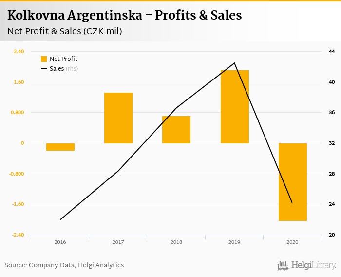 Kolkovna Argentinska made a net profit of CZK -2.04 mil in 2020, down 206% compared to the previous year. Total sales reached CZK 24.1 mil, which is down 43.3% when compared to the previous year.