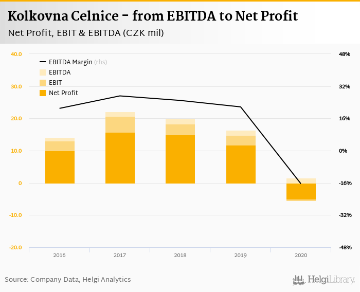 Kolkovna Celnice made a net profit of CZK -4.94 mil with revenues of CZK 23.8 mil in 2020, down by 142% and down by 68.5%, respectively, compared to the previous year. This translates into a net margin of -20.8%.