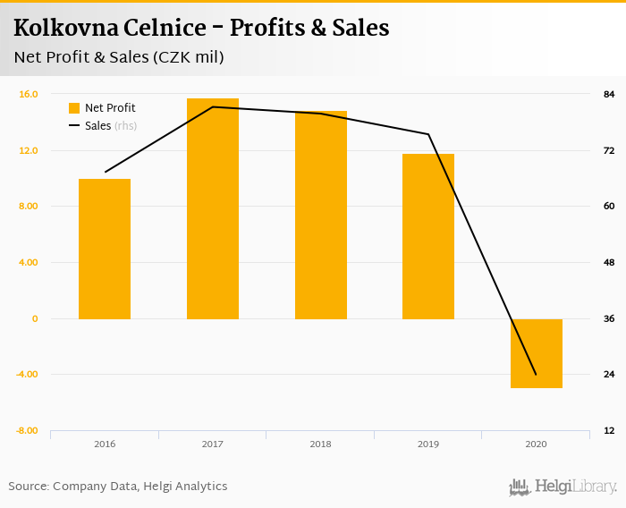 Kolkovna Celnice made a net profit of CZK -4.94 mil in 2020, down 142% compared to the previous year. Total sales reached CZK 23.8 mil, which is down 68.5% when compared to the previous year.