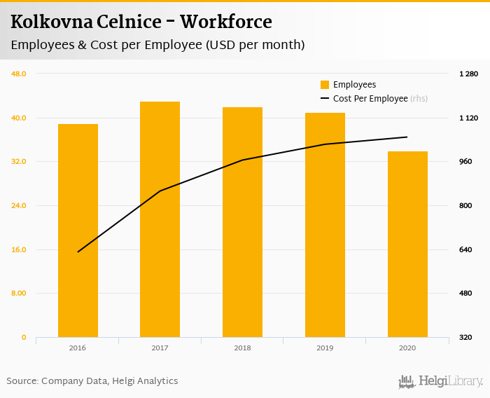 Kolkovna Celnice employed 34.0 employees in 2020, down 17.1% compared to the previous year. Historically, between 2016 and 2020, the firm's workforce hit a high of 43.0 employees in 2017 and a low of 34.0 employees in 2020.