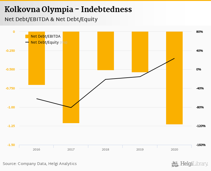 Kolkovna Olympia's net debt stood at CZK 3.34 mil and accounted for 23.3% of equity at the end of 2020. The ratio is up 38.9 pp compared to the previous year.