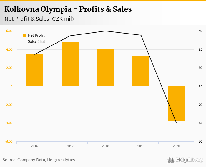 Kolkovna Olympia made a net profit of CZK -3.76 mil in 2020, down 215% compared to the previous year. Total sales reached CZK 15.0 mil, which is down 61.5% when compared to the previous year.