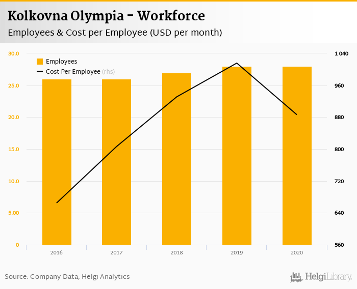 Kolkovna Olympia employed 28.0 employees in 2020, up 0% compared to the previous year. Historically, between 2016 and 2020, the firm's workforce hit a high of 28.0 employees in 2020 and a low of 26.0 employees in 2016.