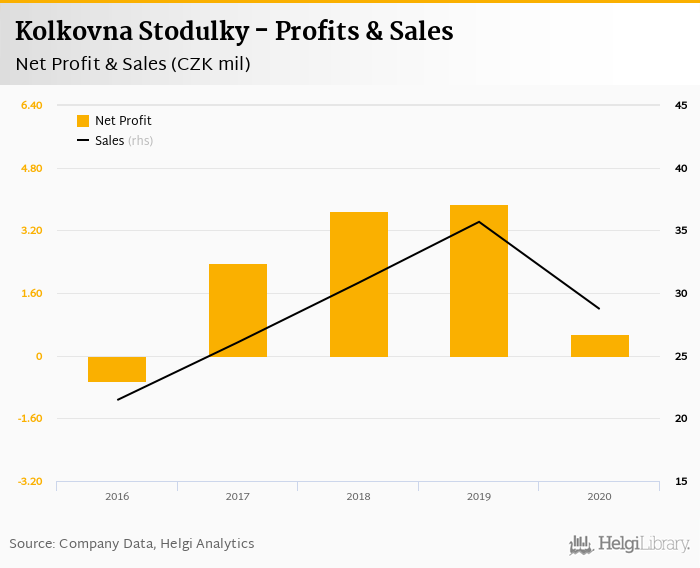 Kolkovna Stodulky made a net profit of CZK 0.545 mil in 2020, down 86% compared to the previous year. Total sales reached CZK 28.7 mil, which is down 19.5% when compared to the previous year.