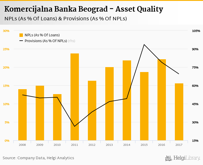 Komercijalna Banka Beograd's non-performing loans reached 15.7% of total loans at the end of 2017, down from 22.2% compared to the previous year. Historically, the NPL ratio hit an all time high of 23.8% in 2011 and an all time low of 12.7% in 2010.