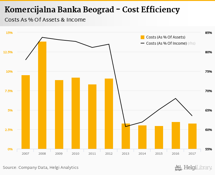 Komercijalna Banka Beograd's cost to income ratio reached 63.5% in 2017, down from 68.0% compared to the previous year.