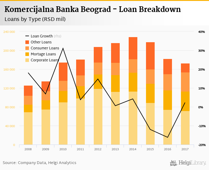 At the end of 2017, Komercijalna Banka Beograd's loans accounted for 52.6% of total deposits and 41.7% of total assets.