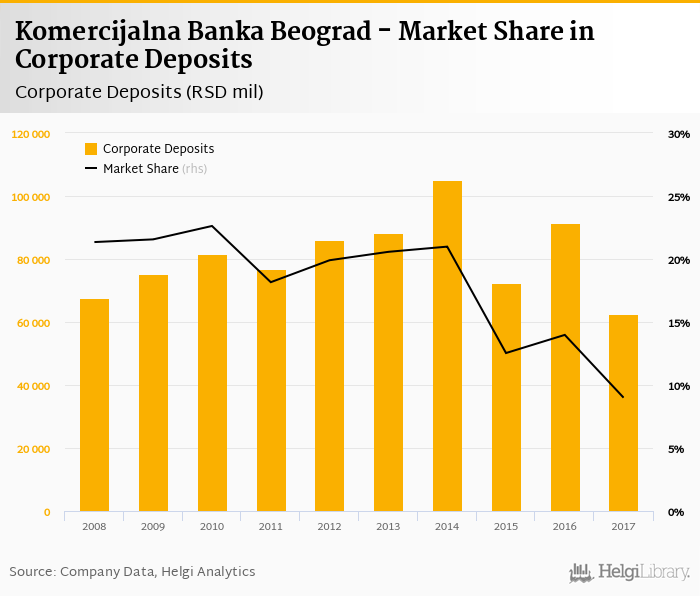 Komercijalna Banka Beograd's corporate deposits reached RSD 62,438 mil in 2017, down 31.6% compared to the previous year.