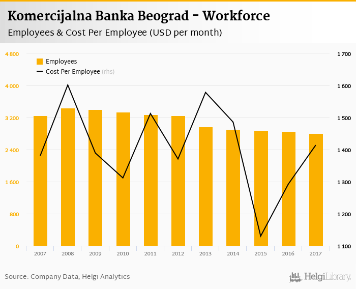 Komercijalna Banka Beograd employed 2,806 persons in 2017, down 1.82% when compared to the previous year. Historically, the bank's workforce hit an all time high of 3,444 persons in 2008 and an all time low of 2,806 in 2017.