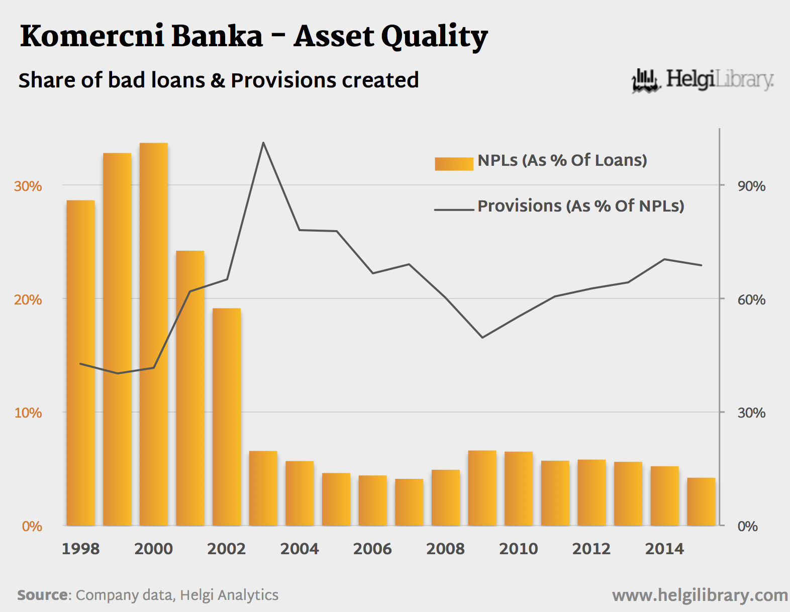 Following hefty loan losses and a government-orchestrated bailout at the end of the 1990s, 60% of the bank was sold to France's Societe Generale in 2001. Since the takeover, Komerční Banka's net profit has increased fivefold and the bank's ROE has been amounting to 10-20%.