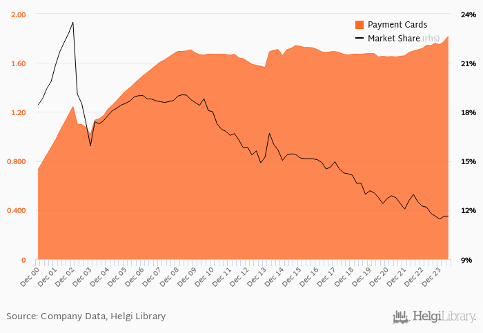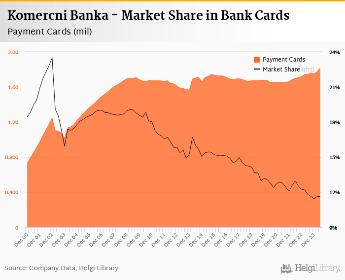 Komercni Banka therefore accounted for 11.6% of all bank cards issued by banks in Czechia at the end of 2024-06-30. Historically, the bank’s market share in payment cards reached an all time high of 23.5% in 2002-12-31 and an all time low of 11.5% in 2023-12-31.