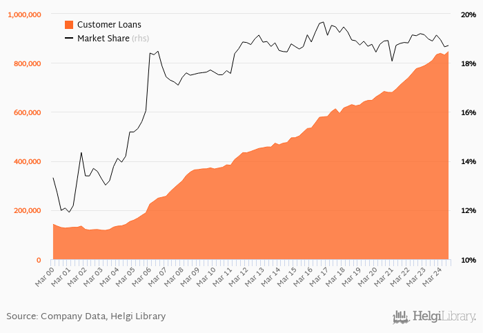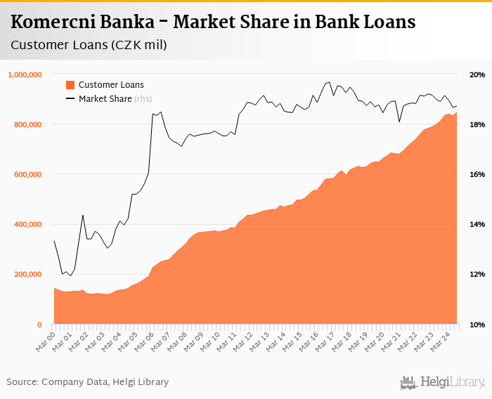 Komercni Banka accounted for 18.7% of all customer loans issued in Czechia at the end of 2024-09-30. Historically, the bank’s market share in customer loans reached an all time high of 19.7% in 2016-12-31 and an all time low of 11.9% in 2001-03-31.