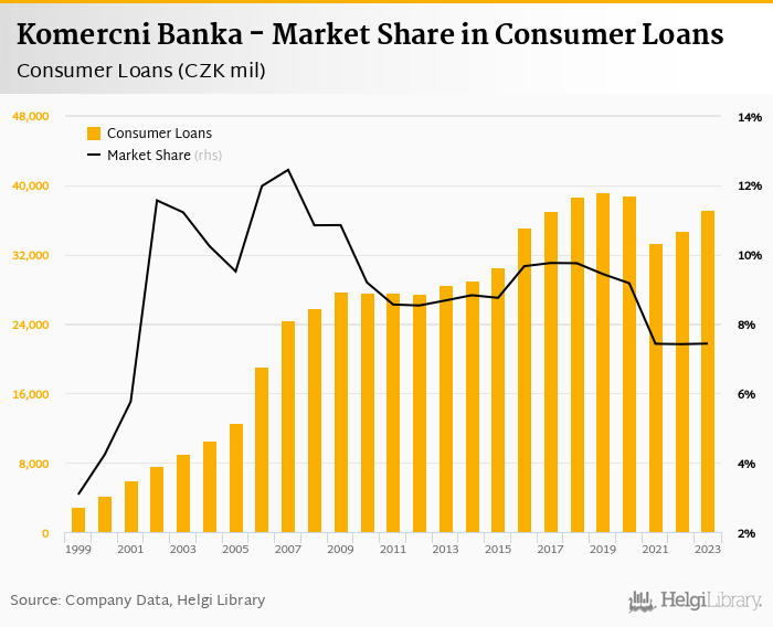 Komercni Banka accounted for 7.44% of all consumer loans issued in Czechia at the end of 2023. Historically, the bank’s market share in consumer loans reached an all time high of 12.4% in 2007 and an all time low of 3.08% in 1999.