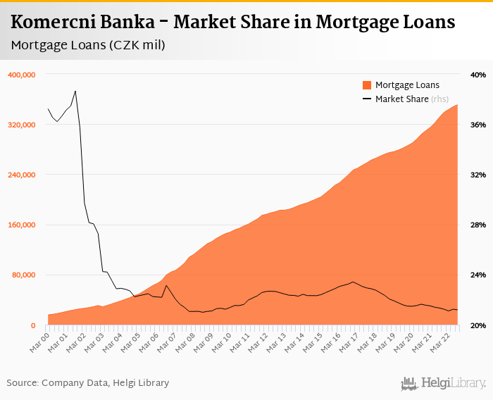 Komercni Banka accounted for 21.2% of all mortgage loans issued in Czechia at the end of 3Q2022. Historically, the bank’s market share in mortgage loans reached an all time high of 38.7% in 3Q2001 and an all time low of 21.0% in 3Q2008.