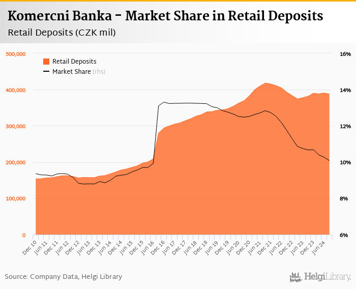 Komercni Banka accounted for 10.1% of all retail deposits taken by banks in Czechia at the end of 2024-09-30. Historically, the bank’s market share in retail deposits reached an all time high of 13.3% in 2016-12-31 and an all time low of 8.79% in 2013-03-31.