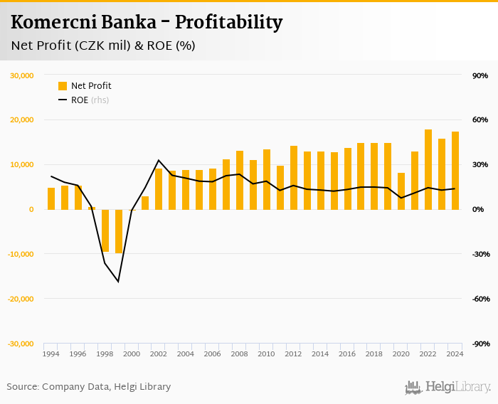 Komercni Banka made a net profit of CZK 17,408 mil in 2024, up 10.0% compared to the previous year. This implies a return on equity of 13.5%.