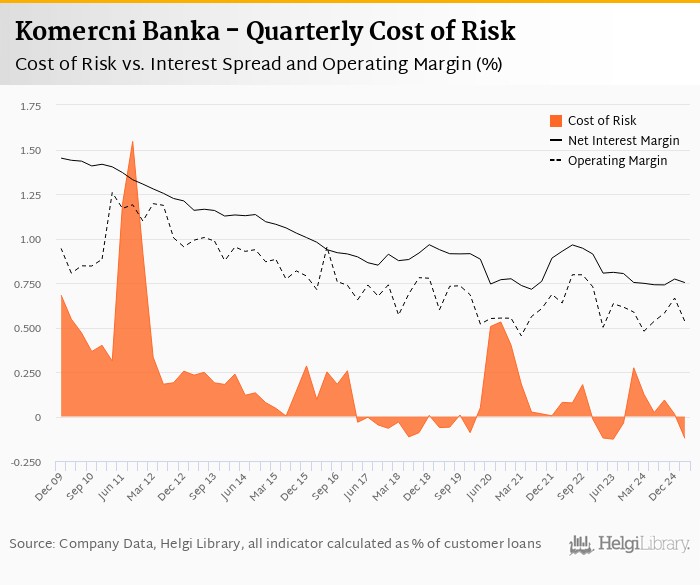 Komercni Banka's Cost of Risk (loan loss provisions as % of total assets) amounted to -0.123% in the first quarter of 2025, down from 0.013% when compared to the previous quarter.