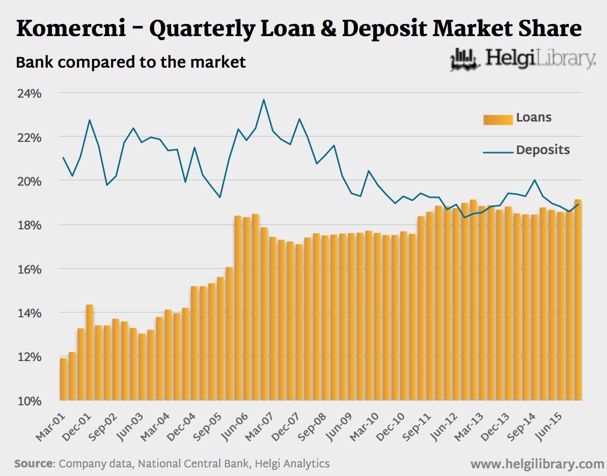 Komercni banka - Quarterly Market Share in Loans & Deposits (Mar01-Dec15)