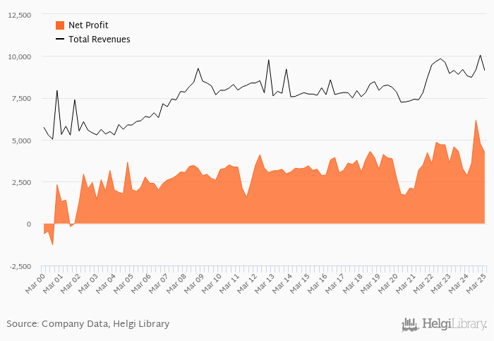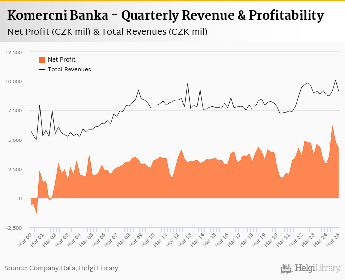 On the other hand, bank’s revenues amounted to an all time high of CZK 10,059 mil in 4Q2024 and an all time low of CZK 5,035 mil in 3Q2000. The average revenues in the last six quarters reached CZK 9,187 mil.