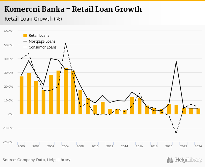 Komercni Banka's retail loans reached CZK 423,300 mil at the end of 2024, up 4.24% compared to the previous year. In the last decade, the average annual loan growth amounted to 6.54%.